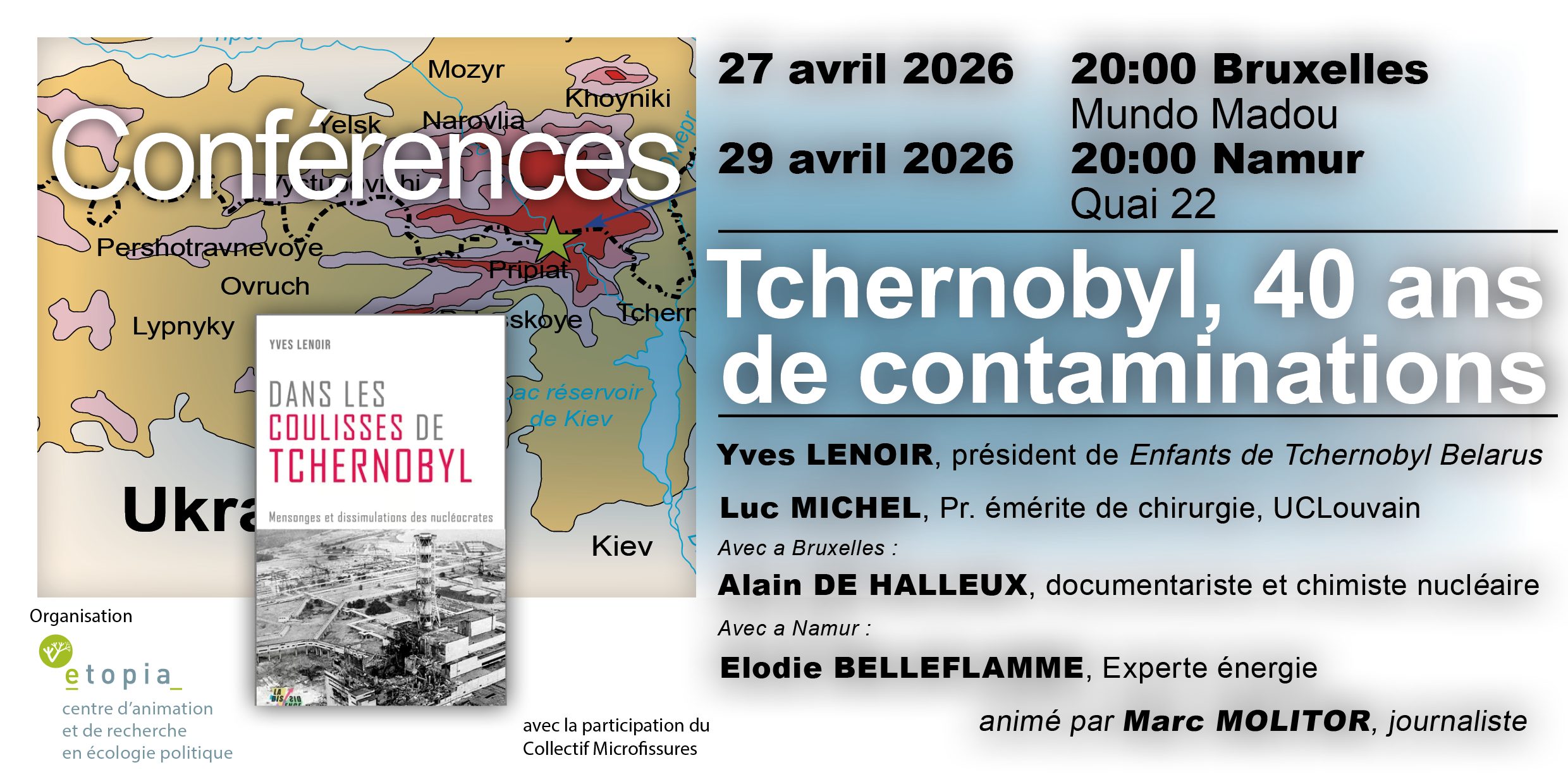 A l’occasion de la commémoration des 40 ans de l’accident nucléaire de Tchernobyl, Etopia, avec la participation du collectif Microfissures, propose deux conférences – le 27 avril à Bruxelles et le 29 avril à Namur – animées par Marc Molitor, journaliste.